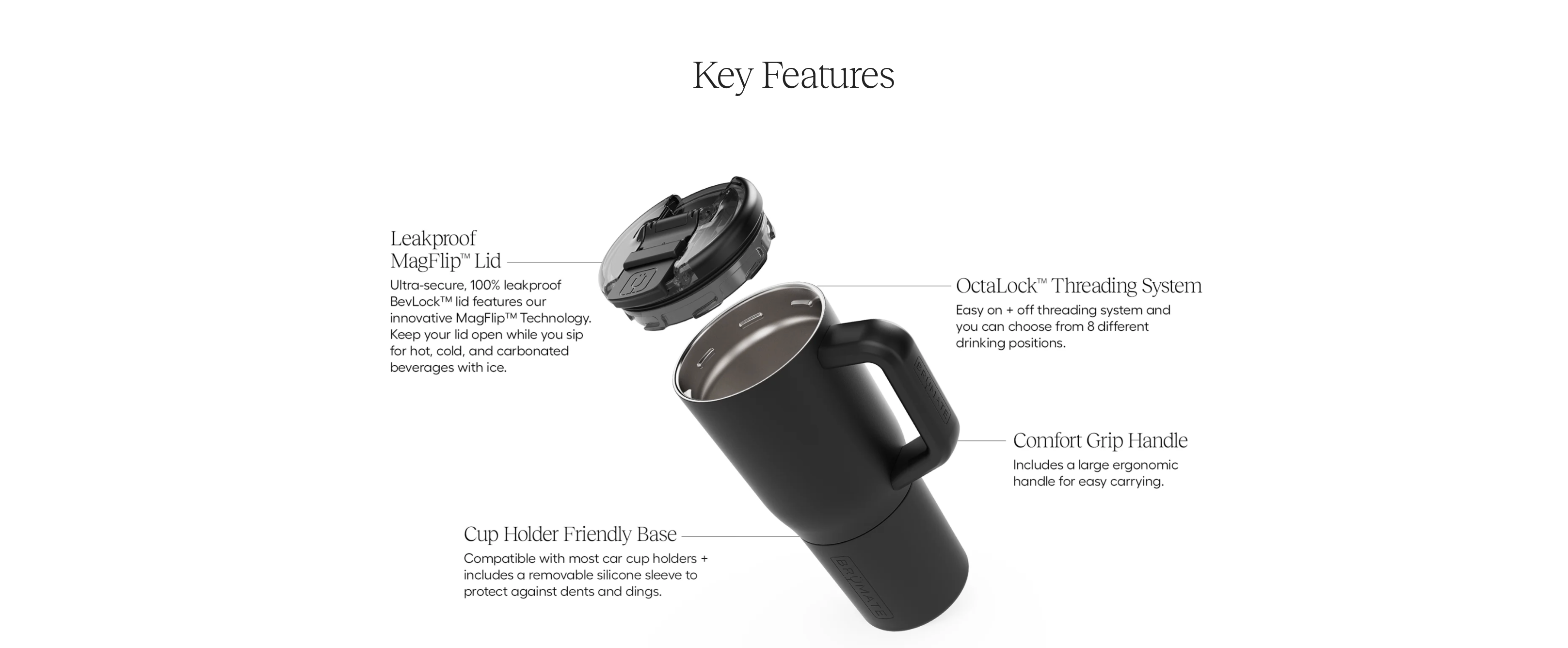 The Navéa wasmade for navigating life’s adventuresand is the most feature-packed travel tumbler there is. It has our 100% leakproof BevLock™ lid to seal in your beverages and stop leaks, our brand-new, OctaLock™ thread system to make taking your lid on and off a breeze, and our MagFlip™ technology to assist in keeping your lid open while you sip. Also equipped with a cupholder-friendly base, a removable, color-matched sleeve for ultimate durability, and our BevGuard™ technology to keep your drinks hot for 6+ hours or cold for 24+ hours.